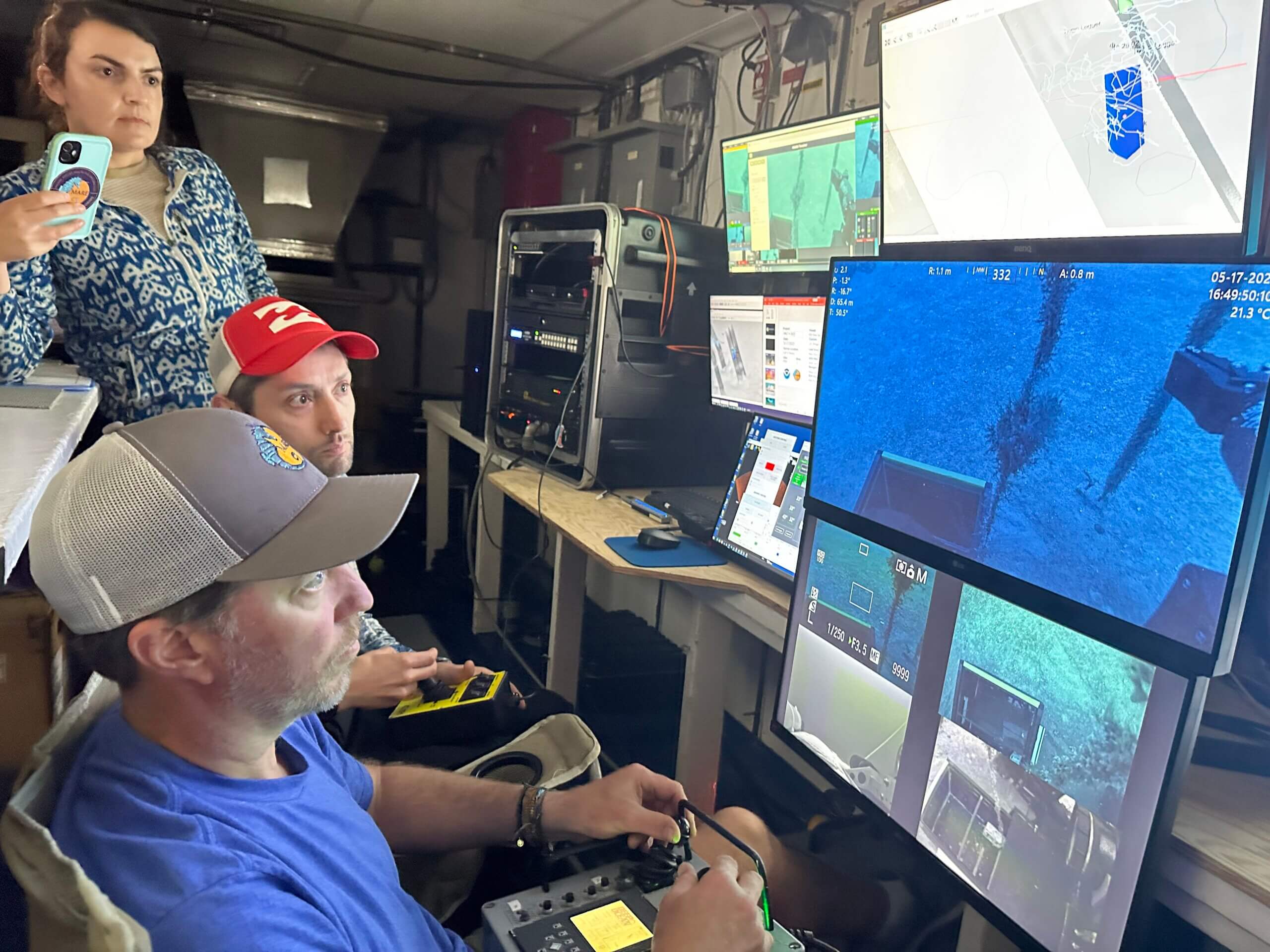 The team deployed TCM-1 tilt current meters while aboard the University of Southern Mississippi’s Research Vessel (R/V) Point Sur. The TCM-1s are attached to lead diving weights and dropped over the side of the vessel to depths of 52 to 65 meters. The meters are then repositioned and/or recovered by a Remote Operated Vehicle (ROV). The ROV Mohawk was used in June and October of 2022 while the ROV Beagle deployed was used in June of 2023.