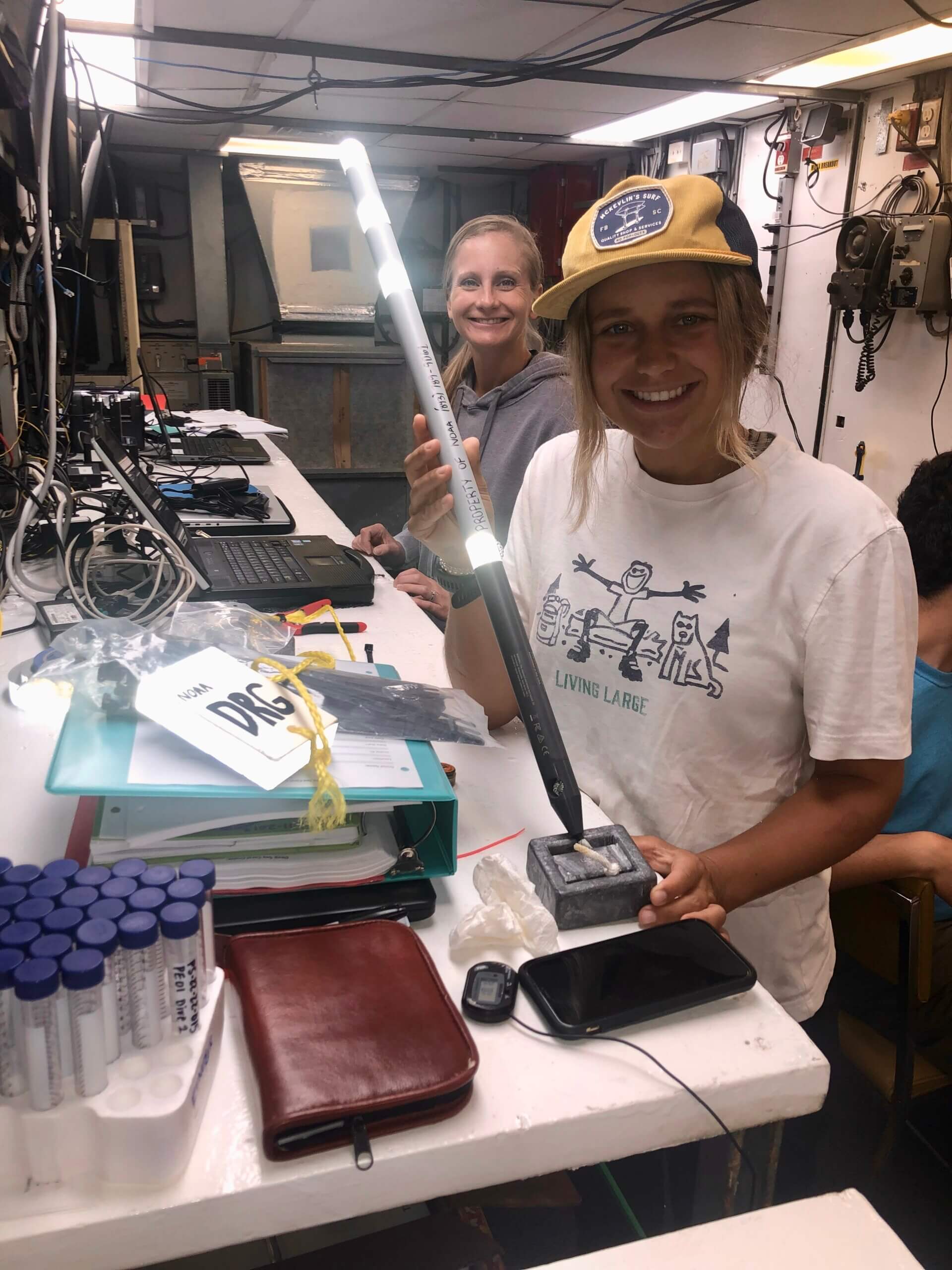 Peter Etnoyer, the Chief Scientist in charge of the mission, and scientist Ren Salgado of Hollings Marine Laboratory, with Kassidy Lange, graduate student at College of Charleston, are managing the live coral husbandry and collection in situ environmental data.