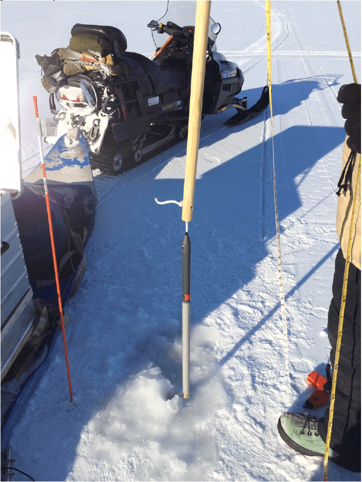 The meters were lowered through the drilled holes and attached to a wooden pole extending just below the underside of the sea ice. “Ocean currents were estimated from the drag on a [Lowell Instruments Tilt Current Meter] attached to the sea ice that measured accelerations and magnetic field strength vectors in all three spatial dimensions,” Muenchow noted, adding, “It is a promising new and simple technology that we successfully put to the test.”