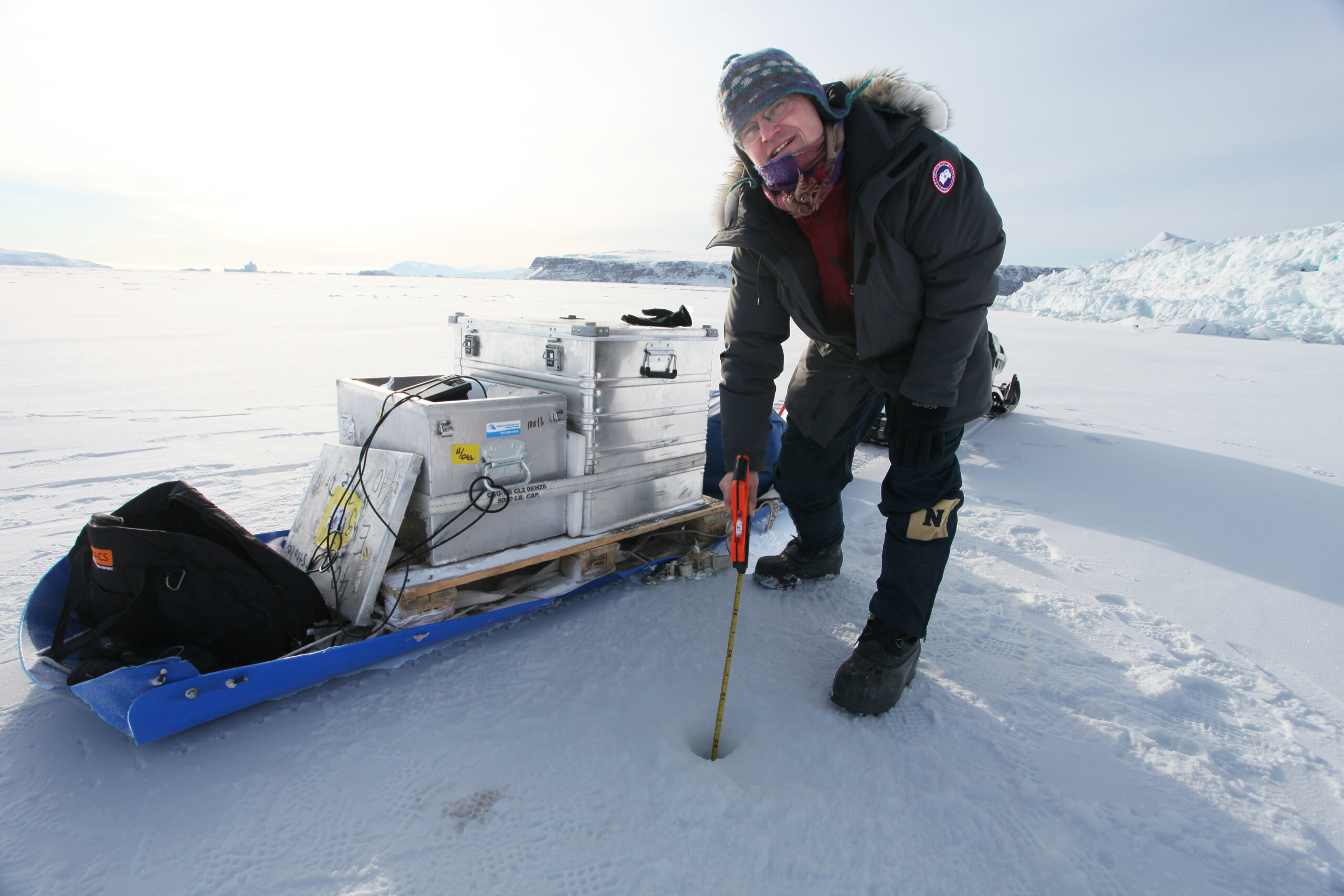 The research was ambitious: the National Science Foundation award funding the project specified that Muenchow should, “design and develop an integrated underwater acoustic sensor network for ice-covered seas.” Muenchow identified land-fast sea ice (ice attached to the land, not free-floating) off Greenland as the perfect location for initial testing. Such a network could have far-reaching consequences in terms of scientific research on Arctic phenomena. First though, a project such as this required extensive research on the acoustic profile and other characteristics of the water just below the land-fast ice, including data on ocean currents.